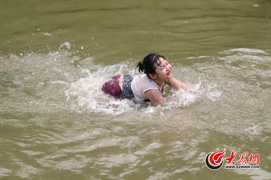 7月4日,山東濟南,兒童在在泉水浴場旁的沙灘區(qū)跳水消暑。當日,山東省氣象臺繼續(xù)發(fā)布高溫黃色預警信號,今明兩天最高溫35度。天下第一泉景區(qū)內的泉水浴場已為市民恢復開放,泉水浴場成為市民納涼消暑的第一選擇。大眾網(wǎng)記者 王長坤 攝