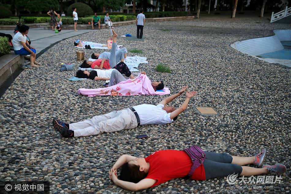 017年7月19日,在安徽淮北市的一個廣場,每天傍晚時分,大叔大媽們紛紛前來,扎堆躺在鵝卵石地面上進行“熱療”,自稱是冬病夏治,在這里利用鵝卵石“熱療”的方法逐漸成了一道風(fēng)景。