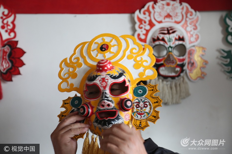 2017年8月1日,在山東濟(jì)南天橋區(qū)萬盛街社區(qū),40多歲的侯志新師傅在家中掛忙了數(shù)百個(gè)候氏社火臉譜。稱自己十分喜歡癡迷畫社火臉譜,并且是第六代氏社火臉譜傳人,10余年時(shí)間在家中畫了有1萬余個(gè)社火臉譜,并且免費(fèi)收徒都有千余名了。