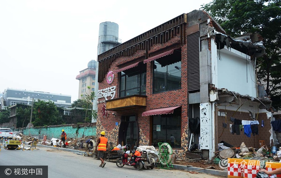 2017年8月2日,濟南,山師東路南段西側的人行道路鋪裝已經鋪設了四分之三。然而,在路西側一家名為“簽滿多串串香”的二層商鋪沒有被拆遷,成為一座孤樓,非常顯眼。