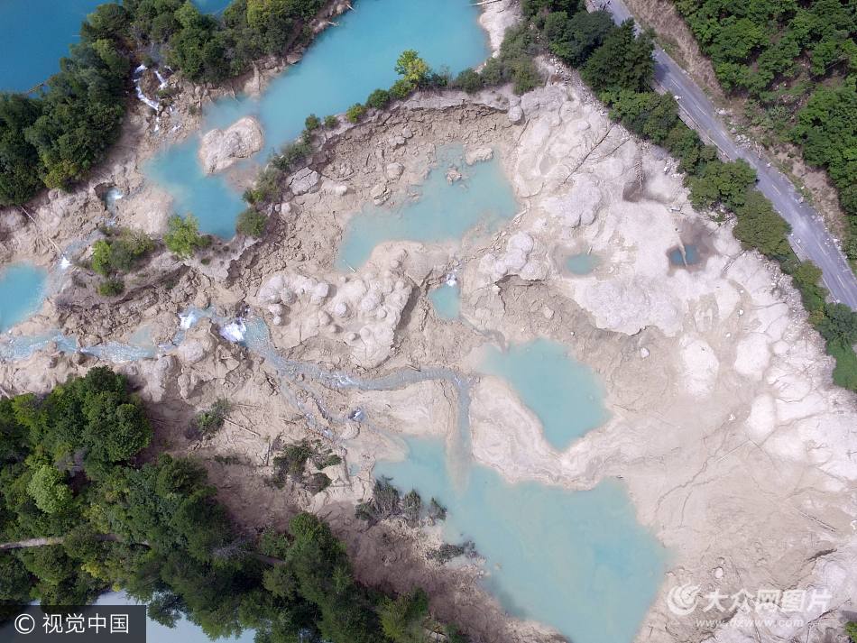 2017年8月10日,四川阿壩,航拍震后的九寨溝景區(qū),著名景點(diǎn)火花海干涸見底,部分海子兩岸出現(xiàn)塌方,水面渾濁。8月8日晚上21時(shí)19分,四川阿壩州九寨溝縣發(fā)生7.0級(jí)地震,震源深度20千米,震中位于北緯33.20度,東經(jīng)103.82度。