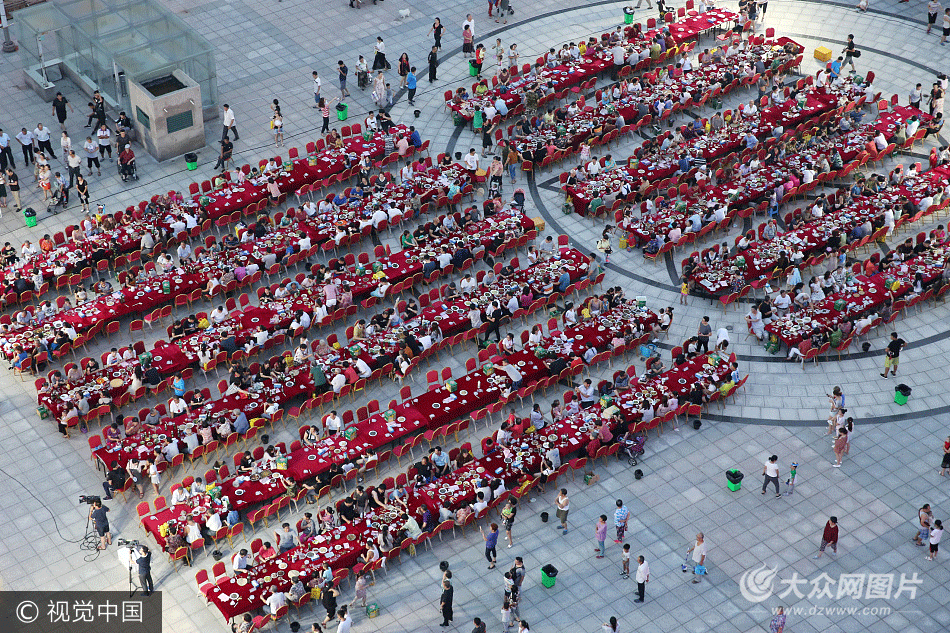 2017年8月12日晚,山東東營,市民在“百家宴”上吃飯聊天看節目,樂享鄰里和睦親情。當天,東營市東營區勝利街道睦鄰文化藝術節在中山社區華都世紀城小區廣場開幕,700多名市民每人端來一盤精心準備的拿手好菜,在廣場上擺出90桌宴席。他們圍坐在一起,品嘗各色美食,暢飲喜慶美酒,話家長里短,看精彩演出,現場其樂融融,溫馨和睦。90張方桌整齊地擺放在廣場上,現場你來我往,場面極其壯觀。