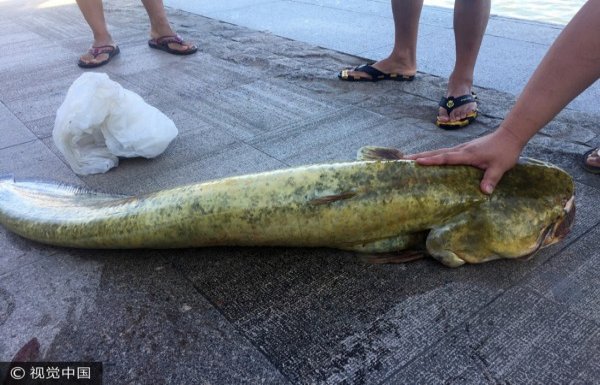 浙江村民釣起1米長鯰魚 花3小時拉出水