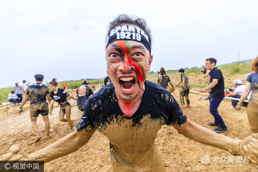 9月10日,青島市,作為全球最大的障礙賽的斯巴達勇士賽,2017英菲尼迪斯巴達勇士賽青島站今天9月10日中德生態園開賽。雖然一直下著連綿細雨,選手們還是斗志昂揚地喊著號子沖刺。