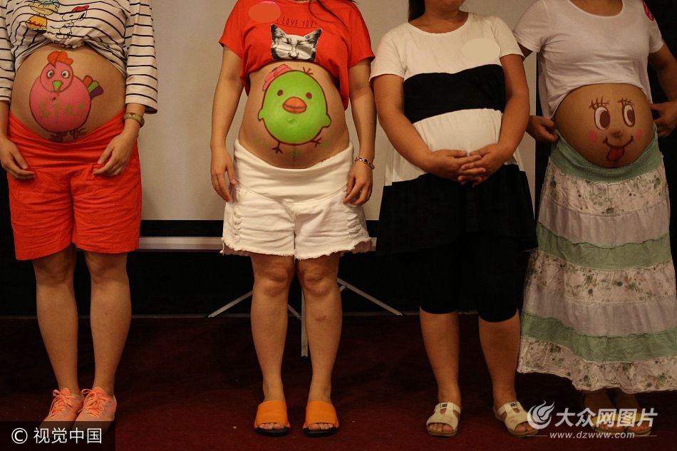 2017年6月,山東濰坊,十幾位準媽媽為迎接寶寶降生,在一彩繪現場由準爸爸們親手描繪肚皮彩繪,“孕”味十足。懷胎十月,對于每一個準媽媽來說都是一件非常不容易的事情,幾名辣媽站在一起,肚皮上的“寶寶們”看上去萌態十足,十分溫馨。