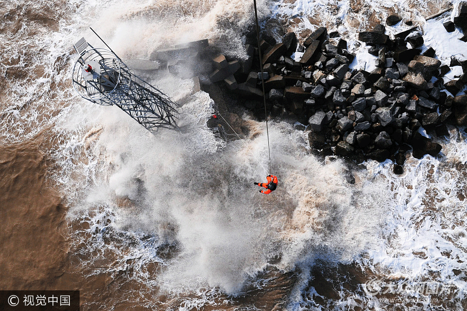 2017年10月2日,山東東營,交通運輸部北海救助局所屬的北海第一救助飛行隊緊急出動專業救助直升機,營救被困海中的遇險者。國慶小長假期間,山東東營一海釣愛好者本想借著假期出海垂釣,沒曾想由于玩的太過投入,漲潮后被困在壩頭,不得不求助海上搜救中心。