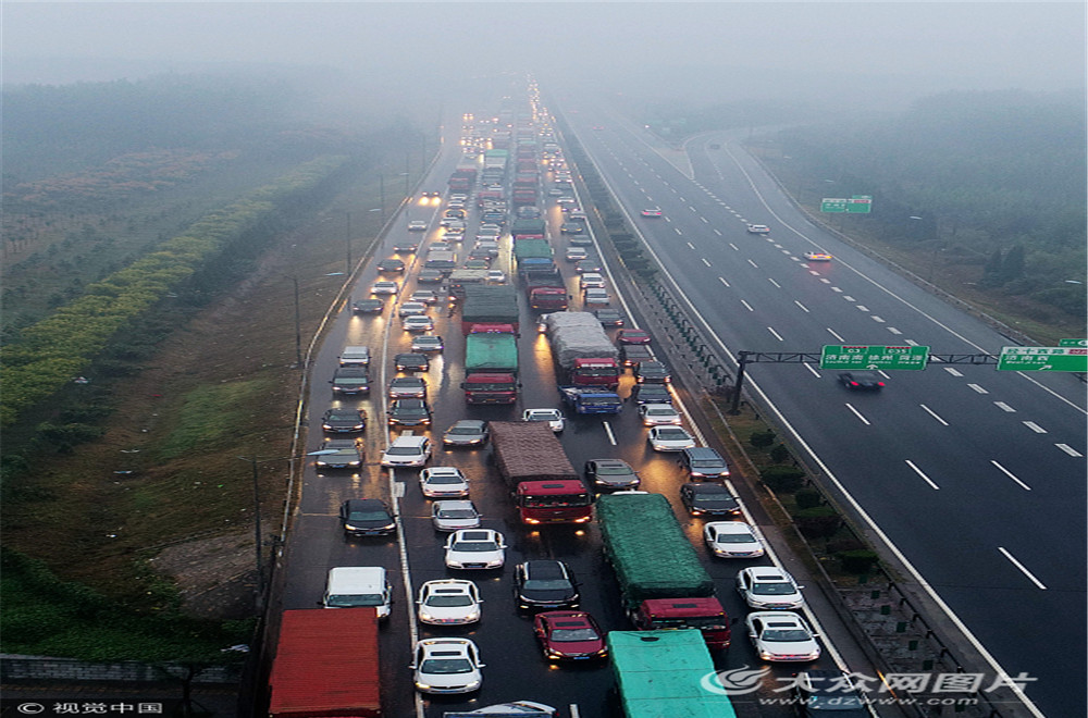 濟南:返程高峰大霧添亂 高速公路堵成“一串紅”
