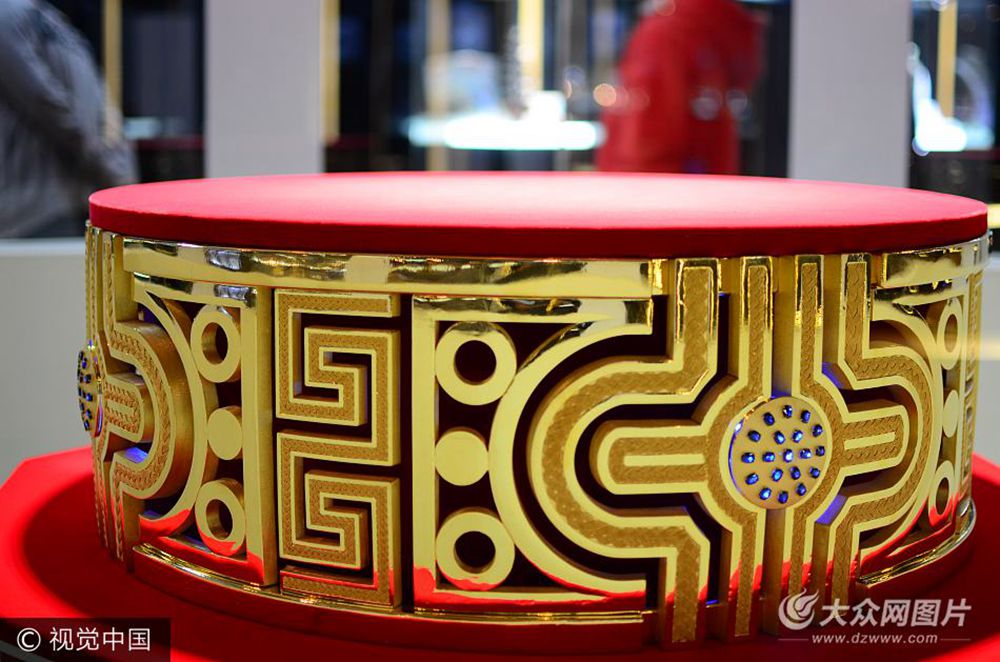 2017年10月13日,世界最大足金戒指亮相山東濰坊昌樂寶石城,該戒指重82.20KG,戒面鑲嵌76顆精品藍寶石,耗時99天制作完成。該戒指采用中國傳統文化符號大紅燈籠、中國結和回形紋為核心設計元素,寓意喜慶、吉祥。據了解,這枚“世界最大金戒指”僅按金價市場價就超過3000余萬元。