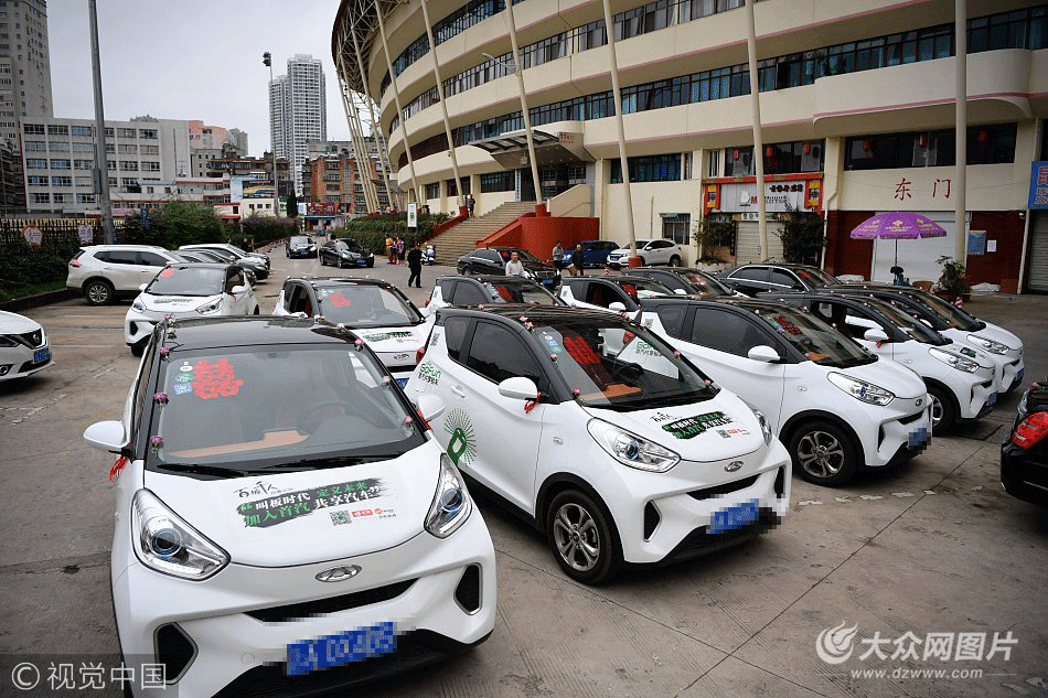 2017年10月22日,昆明,婚車隊集結準備出發。隨著共享經濟的發展,單車、汽車、充電寶等共享項目在中國多地呈現蓬勃發展之勢。當日是昆明90后小伙朱明宇大喜的日子,他和新婚妻子蔣丹宜別出心裁,除主婚車外,其他婚禮用車都是租用共享汽車接送親友,獨樹一幟的車隊吸引不少市民好奇的目光。夫妻倆認為兩個人之間幸福就好,用什么樣的車本身就不是一件特別重要的事情,拿共享汽車來做婚車就是想留下特別的回憶,同時因為共享汽車是新能源汽車,也算是為環保貢獻一點力量。 劉冉陽(云南分社)/中新社/視覺中國
