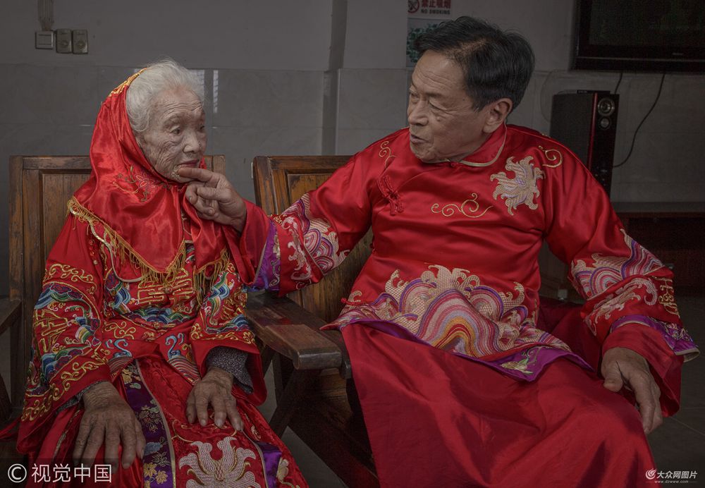 2017年10月22日上午9時許,96歲的魏阿婆穿上龍鳳褂準備拍照,旁邊穿上新郎服的是他75歲的兒子蔡炳杰。他們將拍攝一組結婚照,那是母親一輩子的心愿,也是蔡炳杰一輩子的心愿。