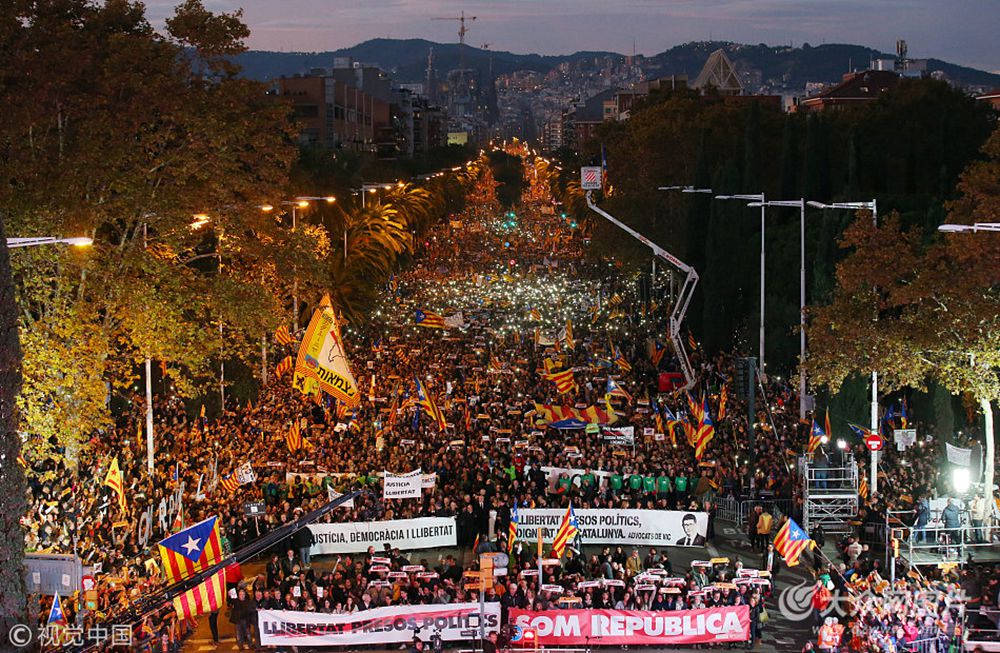 當(dāng)?shù)貢r(shí)間2017年11月11日,西班牙巴塞羅那,親獨(dú)立者舉行大規(guī)模游行,要求釋放加泰羅尼亞地區(qū)活動(dòng)家和領(lǐng)導(dǎo)人。