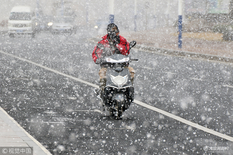 山東煙臺迎來今冬首場降雪 市民冒雪出行