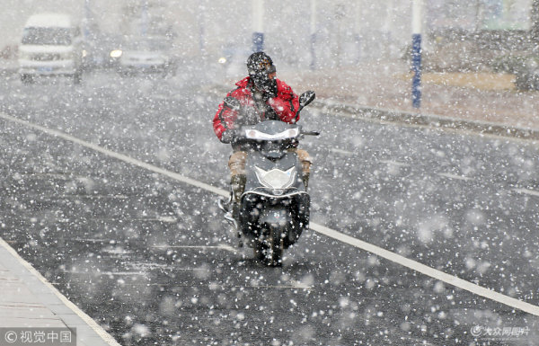山東煙臺迎來今冬首場降雪 市民冒雪出行
