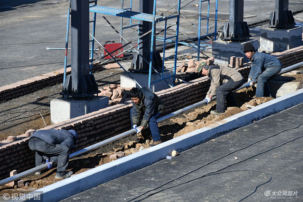 2017年12月19日,山東煙臺,龍煙鐵路煙臺西站站外廣場,四位農民工在進行路燈安裝工程作業,迎接12月28日龍煙鐵路正式載客運營。