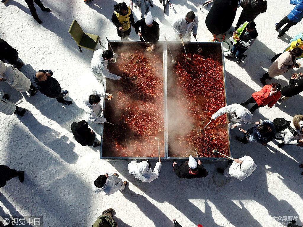 2017年12月24日,河南洛陽(yáng)欒川伏牛山滑雪場(chǎng),氣溫零下10攝氏度,數(shù)百民眾圍在一個(gè)邊長(zhǎng)3米多面積達(dá)10平方米的自制"土火鍋"前,免費(fèi)享用火鍋盛宴。據(jù)了解,這個(gè)超級(jí)土火鍋容納的湯料重達(dá)3噸,所用食材達(dá)上百種,包括當(dāng)?shù)厣絽^(qū)的土雞、山羊肉、炸丸子、山蘑菇、欒川豆腐、山野菜等。 王中舉(河南分社)/中新社/視覺(jué)中國(guó)