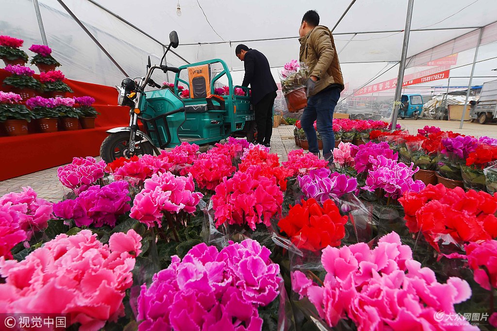 2017年12月29日,山東濰坊,新年來(lái)臨,青州市黃樓街道的近千戶花農(nóng)聯(lián)合起來(lái)舉辦了年宵花展銷會(huì),蝴蝶蘭、仙客來(lái)、杜鵑、大花蕙蘭、鳳梨等千余個(gè)帶有濃郁新年氣息的特色花卉品種吸引了眾多客商前來(lái)選購(gòu),市場(chǎng)一片紅火。山東省濰坊青州市有“中國(guó)花木之鄉(xiāng)”稱號(hào),全市花卉種植面積達(dá)12.9萬(wàn)畝,年交易額110億元。