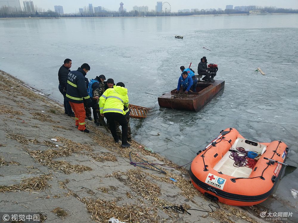 2018年1月2日,山東濱州鬧市區(qū)蒲湖公園,一名男子在結(jié)冰的湖面上釣魚時(shí)不慎掉進(jìn)冰窟窿。隨即,濱州公安派出所、消防、濱州藍(lán)天救援隊(duì)及120急救馬上趕赴現(xiàn)場(chǎng)施救。