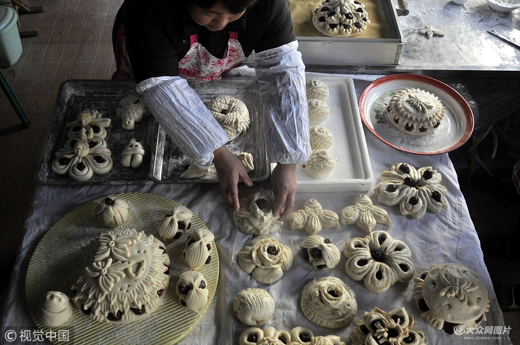 1月5日,迎來二十四節氣中的小寒。山東省茌平縣博平鎮大桑村的村民們從這一天開始制做花糕、做花饃的面食生意就忙碌紅火起來,來自北京、東北、新疆、內蒙等地的訂單也源源不斷的增加。當地村民們組成一起忙著加工制作花糕、花饃等面食以供應春節市場。作者:攝影師/視覺中國