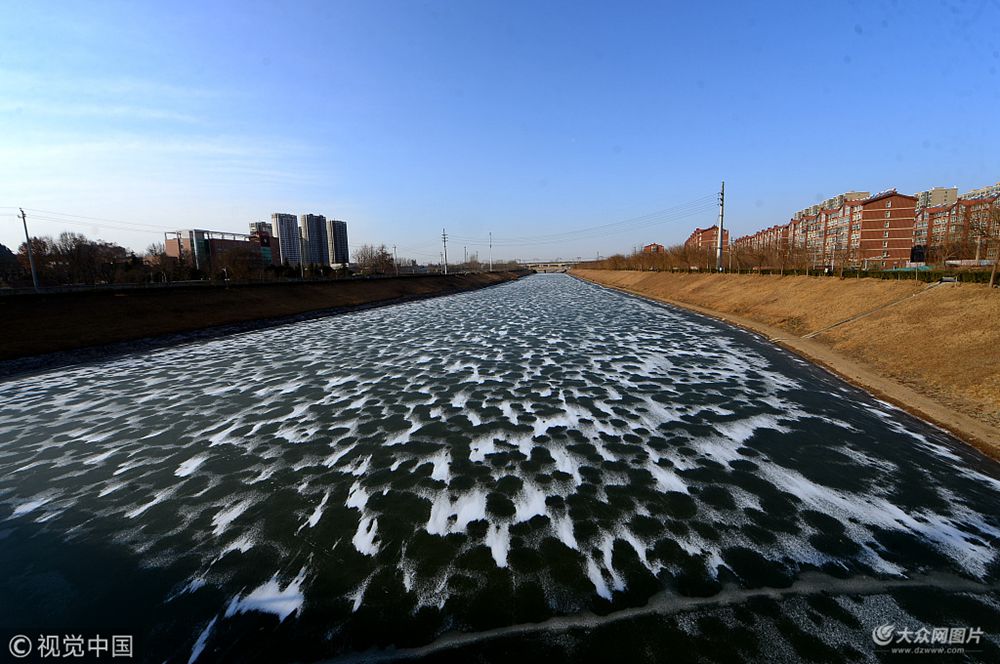 8日,泉城迎來一股較強冷空氣,伴隨著3-4級的北風,城區最低氣溫降至-7.6℃,全天最高氣溫也只有1℃左右,走在戶外感覺格外的寒冷。9日是三九第一天,進入一年中最冷的季節,預計最低氣溫降至-9℃。持續的寒冷天氣,讓臘山分洪道全部冰封,總長度達到3000米,前一日落在冰面上的雪花并未融化,在大風的吹動下出現不規則的圖案,形成巨型冰雪畫。