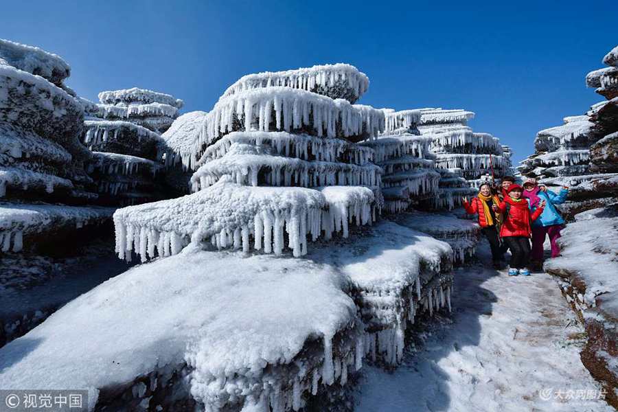 2018年1月9日,貴州省銅仁市松桃苗族自治縣盤石鎮當造村紅石林天氣轉睛。紅石林景區內里層層疊疊、奇形怪狀的石林上吊著一排排冰掛、白雪皚皚與藍天相互輝映,美景如畫,吸引各地攝影愛好者和游客游覽觀光。