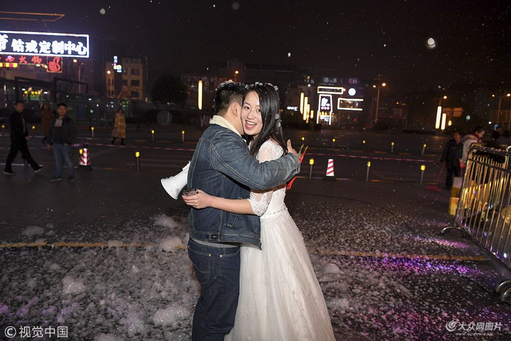 2018年1月18日,女孩身著婚紗在室外等待男友。當(dāng)晚,長(zhǎng)沙持續(xù)低溫,一位身著婚紗的女孩在長(zhǎng)沙街頭開(kāi)啟了泡沫造雪機(jī),向戀愛(ài)七年的男友求婚,并成功獲得男友“芳心”。 楊華峰(湖南分社)/中新社/視覺(jué)中國(guó)