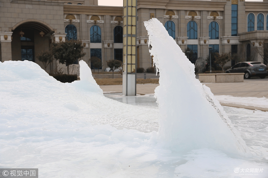 2018年1月27日,山東濱州,持續(xù)低溫天氣令氣溫驟降,當?shù)匾患掖缶频觊T前的大型噴泉被凍成了“冰山”,引來許多市民前來圍觀。