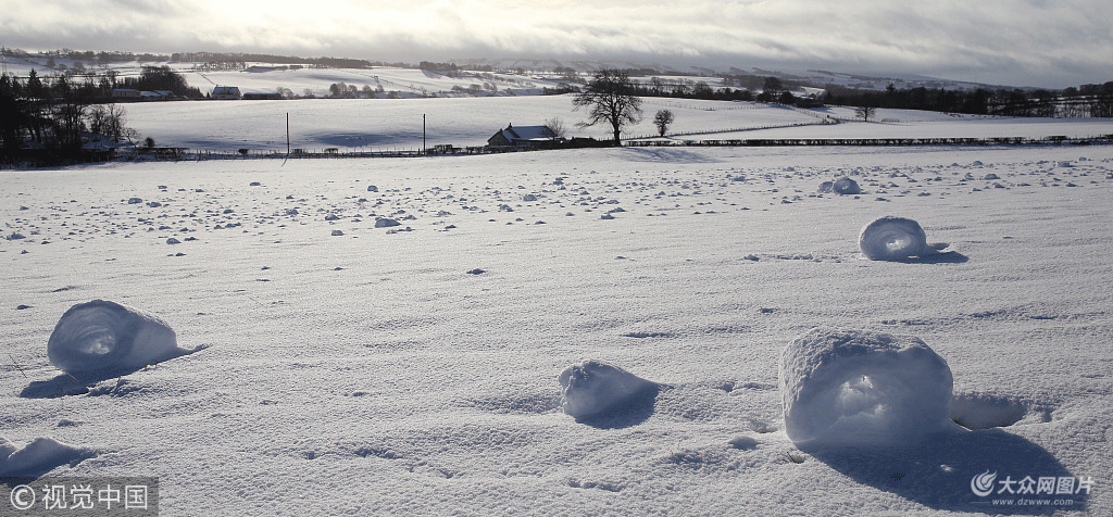 2018年1月30日訊(具體拍攝時間不詳),據英國《每日郵報》1月18日報道,在英國蘇格蘭南拉納克郡的格拉斯福德發現了一片不尋常的雪卷。尤妮斯·克拉克(Eunice Clarke)在南拉納克郡的格拉斯福德發現這一片不同尋常的雪卷。她說道:“我們這里下了一早上的雪,在我出門遛完狗回來閑逛的時候,發現了這些雪卷,它們就像微型的干草卷,只是是由雪做成的。”