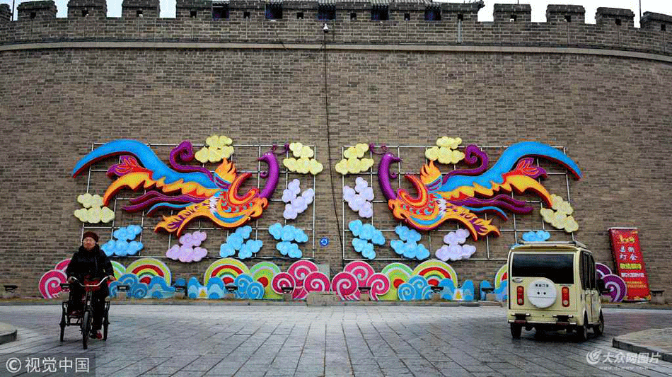 2018年1月30日,山東聊城古城區(qū)亮相多組巨型花燈,這些花燈是為2018年新春燈會專門打造制作的,亮相的的花燈主要突出展現(xiàn)傳統(tǒng)中國節(jié)日元素,一般高度都在10米左右,被懸掛在古城區(qū)的城門之上,遠望去喜氣洋洋年味漸濃。