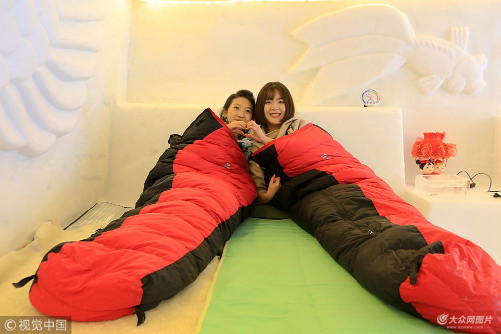 2018年2月4日,黑龍江漠河。北極村里,游客在冰雪旅館里體驗。據悉,這是我國最北端的冰雪旅館,房間價格是每天1280元。冰雪旅館的室內設施主要由冰雪制作,前來體驗的多是廣東、福建、湖南等地的南方游客,游客的年齡多在20-30歲之間。