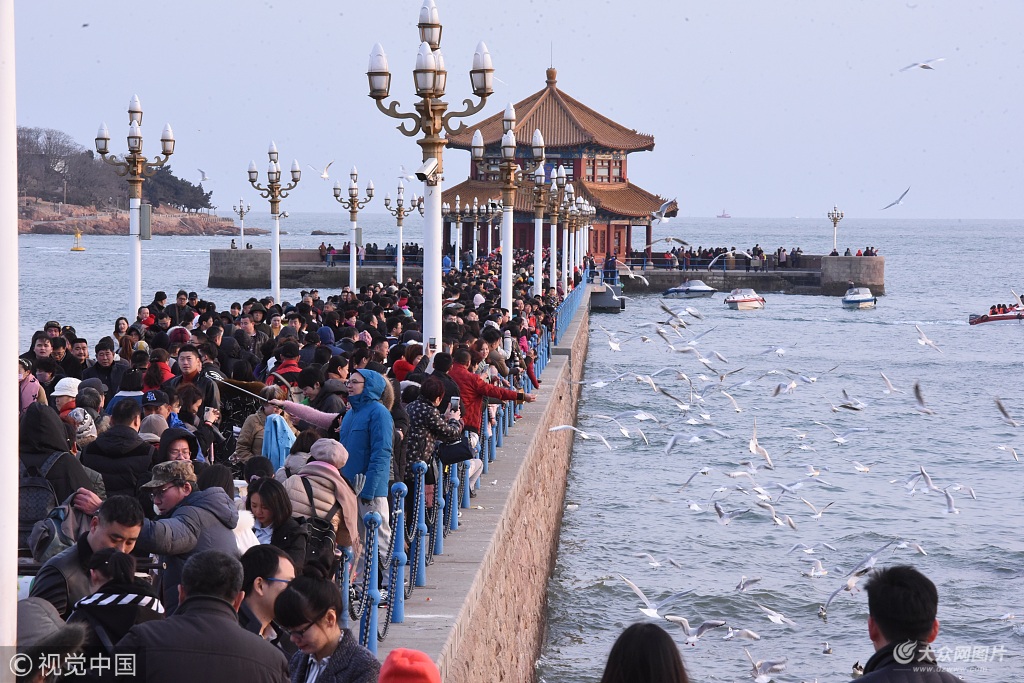 2018年2月18日,農歷大年初三,青島迎來了藍天白云的好天氣,雖然氣溫較低,但棧橋景區卻依舊游人如織。前來游玩的游客大多是“全家出動”,扶老攜幼,一家人其樂融融。游客在棧橋觀海景、喂海鷗,快樂過新年。