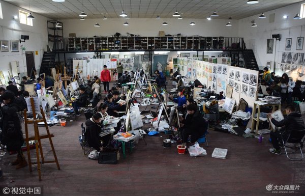 2月24日早晨,六千多名考生在濟南舜耕國際會展中心參加山東工藝美院舉行的美術類專業入學考試。一年一度的高考藝考“大戰”開場,這些經歷了數年苦練的學生們猶如踏上獨木橋,競爭激烈。 圖片來源:視覺中國