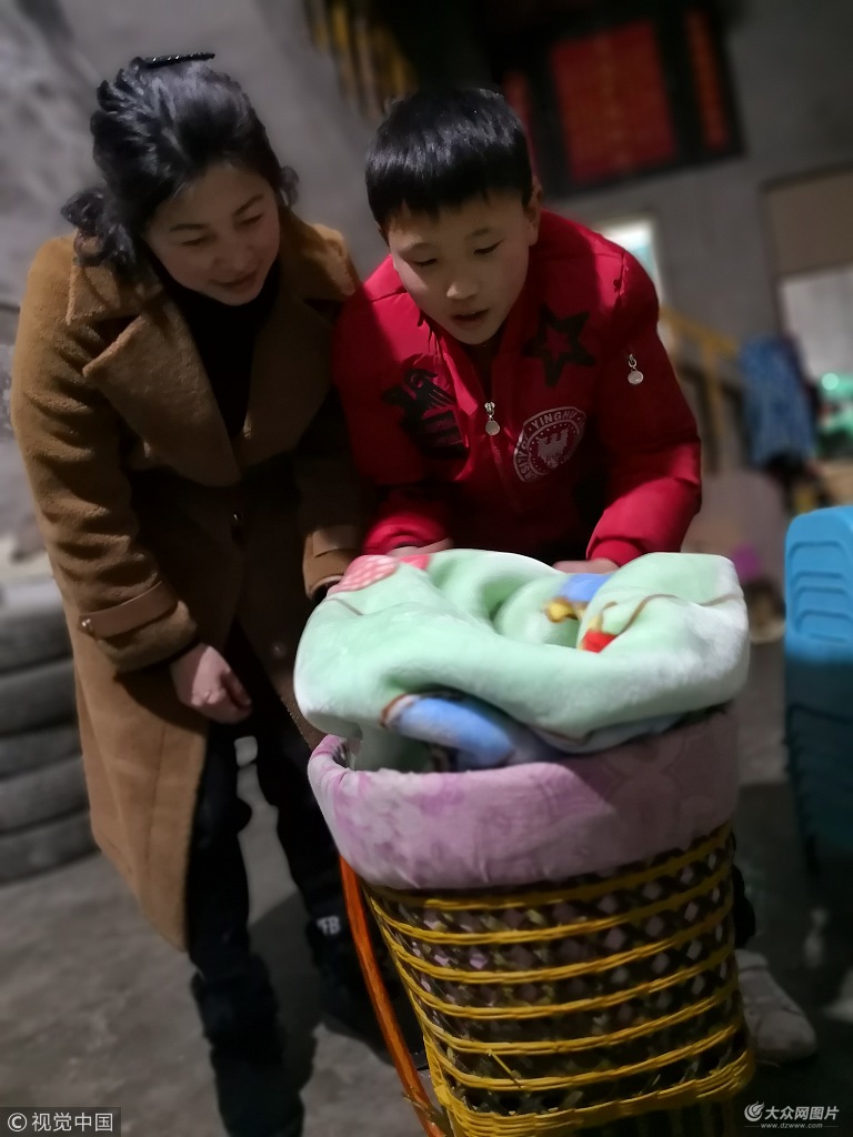 2018年2月13日,浙江衢州。春節期間,浙江龍游民工子弟學校女教師王開宇在貴州山區家訪,學生田太陽教老師如何用背簍。