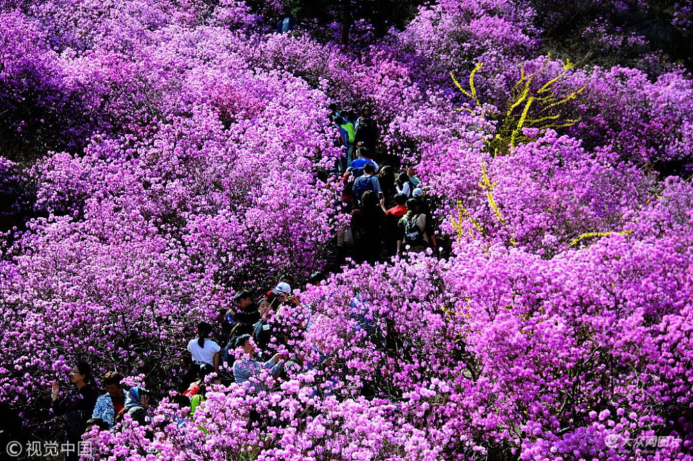 3月31日,青島西海岸新區(qū)大珠山杜鵑谷,漫山盛開的杜鵑花吸引了不少游客游覽。