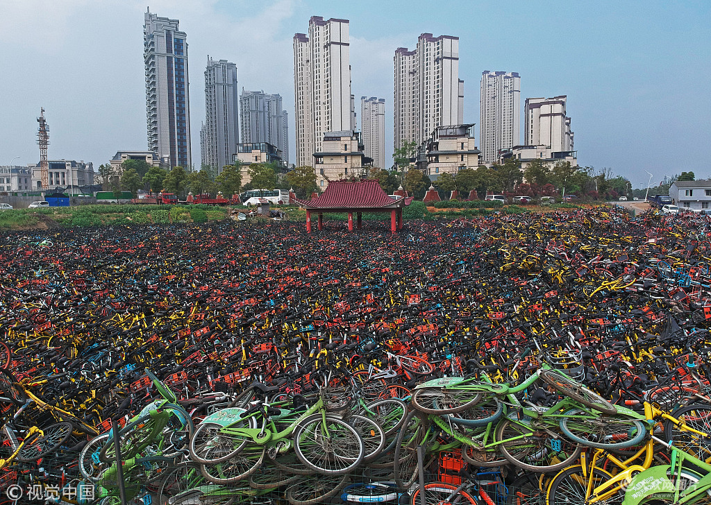 2018年4月2日,武漢一塊空地約有2000平方米,雜草叢生,空地上堆滿了共享單車,這些單車疊起平均有一人多高,有的地方甚至將近兩米高。部分車輛已經蒙了灰塵,但有的車身依舊嶄新。