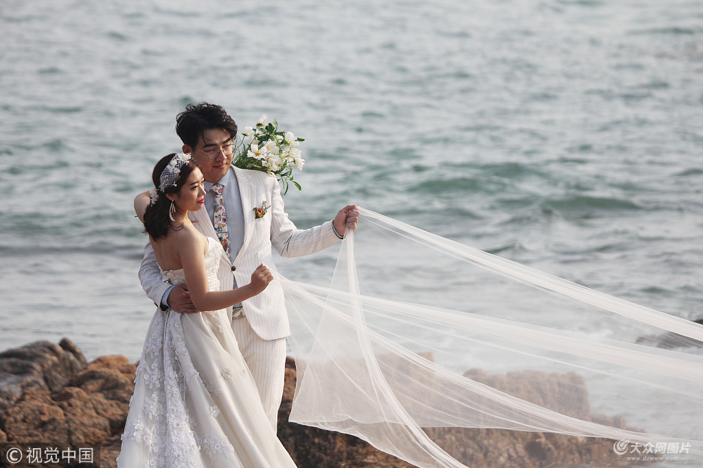 青島:新人扎堆拍婚紗照 海邊定格幸福時光