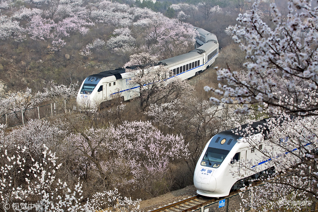 2018年4月2日,北京,居庸關花海景區迎來觀賞高峰,山桃花杏花開了,火車行進在花叢中美如仙境。