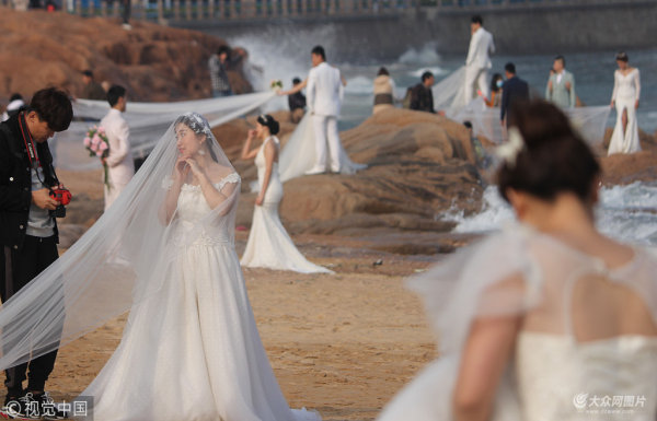 青島:新人扎堆拍婚紗照 海邊定格幸福時光