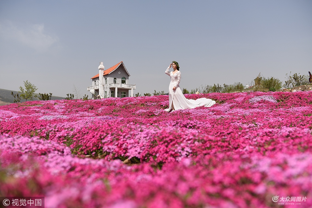 2018年4月15日,山東臨沂,近日,沂南縣張莊鎮布拉格香草園漫山遍野的芝櫻進入最佳觀賞期,一片片梯田仿佛是一張張巨型紅地毯,在“童話建筑”點綴下,宛若浪漫唯美的“夢幻仙境”,令人驚艷,吸引了大批游人前來觀賞拍照。