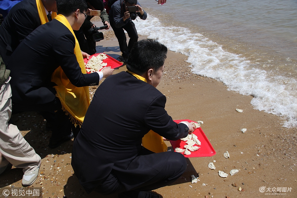 2018年4月20日,山東榮成,漁民在使用鲅魚水餃祭海。