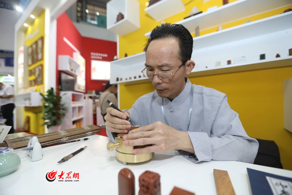 在曲阜印章展臺,孔府印閣的篆刻師張國亮現場展示傳統篆刻技藝。