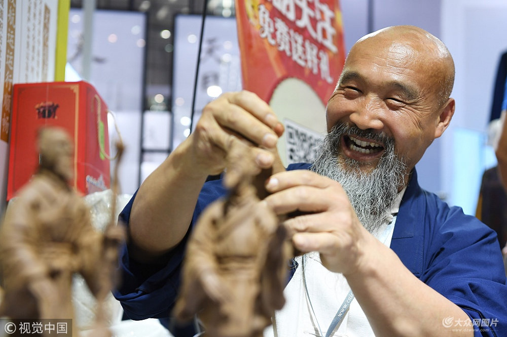 2018年5月11日,在第十四屆中國(深圳)國際文化產(chǎn)業(yè)博覽交易會(huì)上,展示的福建石影雕、福建德化白瓷、山東泥人、深圳鍛造銅雕等作品吸引參觀者。圖為山東泥人文化傳承人演示。