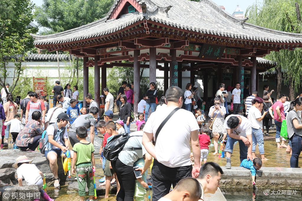 2018年5月13日,在山東濟南五龍?zhí)讹L景區(qū)內(nèi),眾多市民扎堆聚集在泉水石縫中感受清涼,現(xiàn)場十分火爆。當日,最高氣溫達到33攝氏度左右,天氣逐漸變熱,市民用不同方式享受清涼。