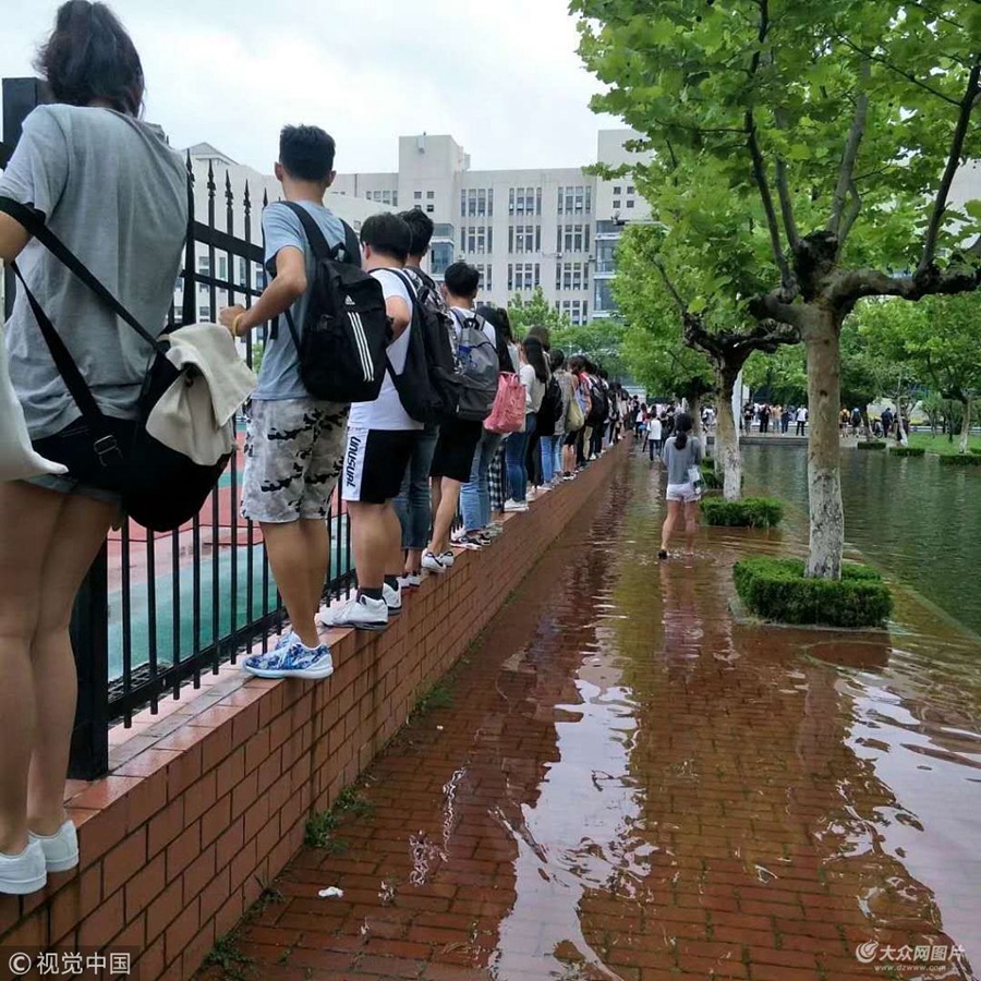 6月26日,山東煙臺大學暴雨后道路積水嚴重,不少學生為了上課需要"飛檐走壁"。
