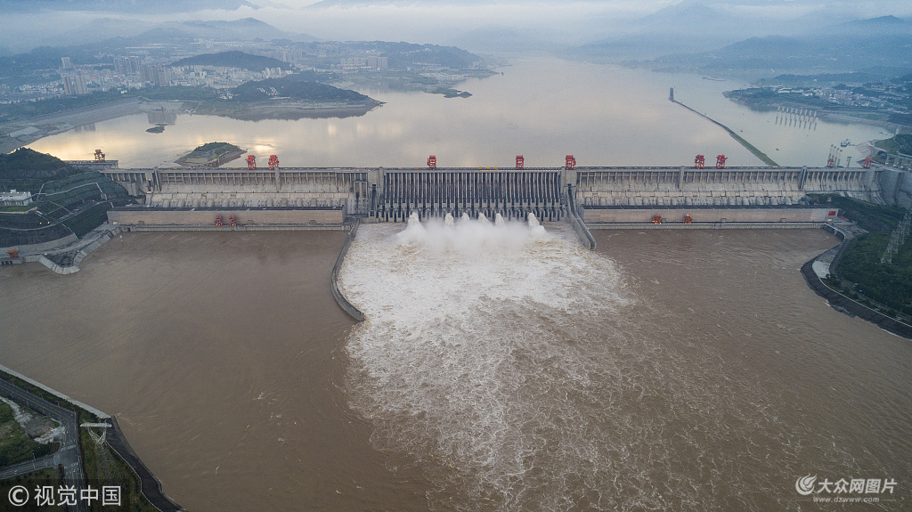 2018年7月13日,湖北宜昌,三峽大壩開啟泄洪深孔下泄上游來水騰出庫容。