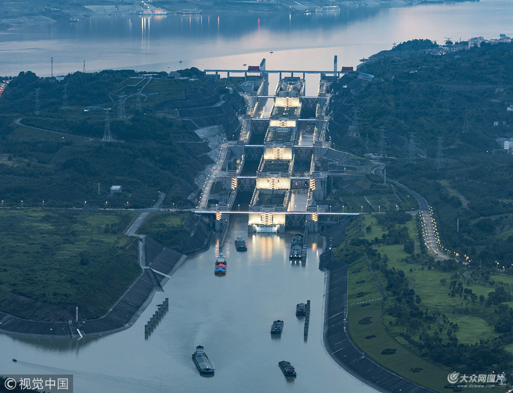 2018年8月1日,湖北宜昌,船舶有序通過三峽五級船閘。