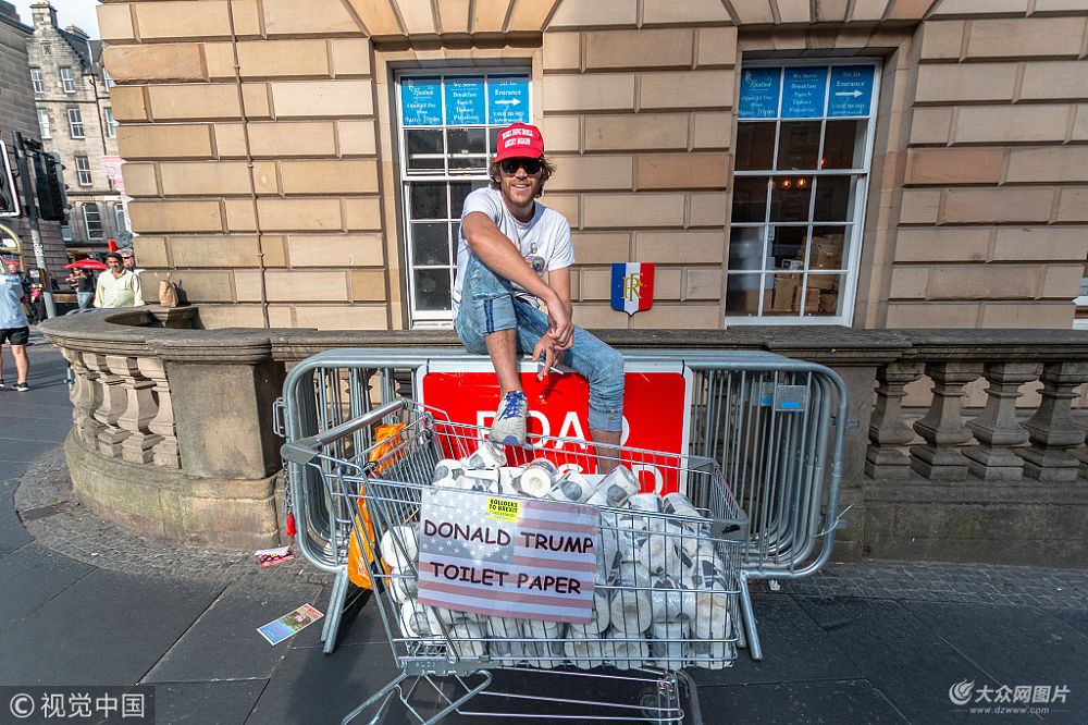 2018年8月8日訊(具體拍攝時間不詳),英國愛丁堡,29歲的Tim Baker在愛丁堡邊緣藝術節上售賣印有美國總統特朗普頭像的衛生紙。按照一卷3磅兩卷5磅的價格,僅僅4天的時間他就賣出了一千卷,照這樣的速度,一周內便能收入四千多英鎊(約合人民幣4萬元左右)。