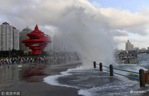 青島受臺(tái)風(fēng)“摩羯”影響 海邊巨浪拍岸