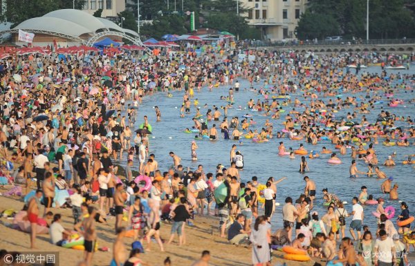 青島34℃高溫來襲 海灘游客密集扎堆避暑納涼