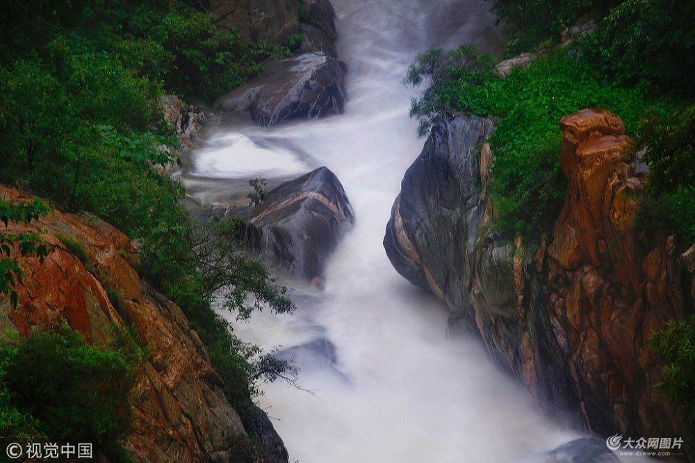 2018年8月19日,山東泰安,連日來的降雨,使得泰山龍?zhí)讹w瀑、高山流水等泰山水景再現(xiàn),雨中的泰山大石峽水流湍急,龍?zhí)讹w瀑直流而下,聲勢(shì)浩大,氣勢(shì)恢宏,吸引來眾多游客和市民冒雨前來賞景。