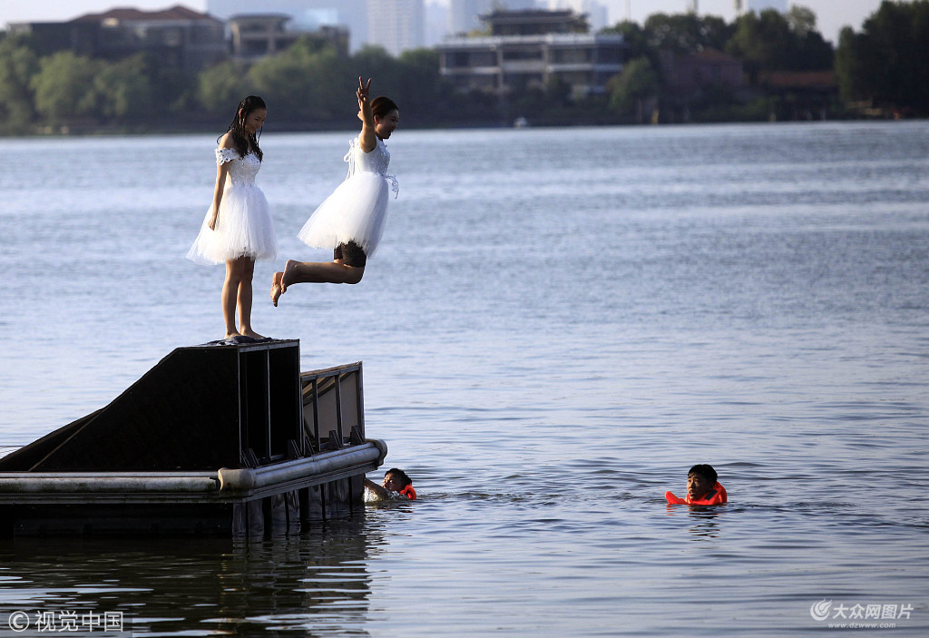 武漢上演傳統項目“跳東湖” 市民穿婚紗戴面具花樣百出放飛自我